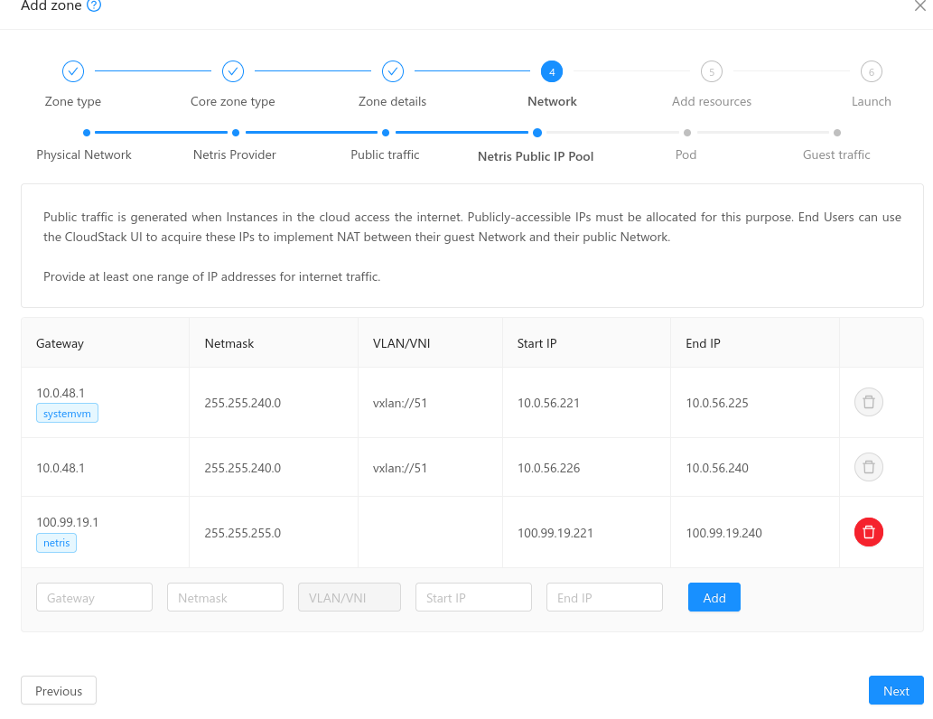 The subsequent steps of zone creation remain unchanged and once the zone is successfully created and enabled, the system VMs come up with IPs from the Public IP Range reserved for System VMs (not the Netris public IP range).