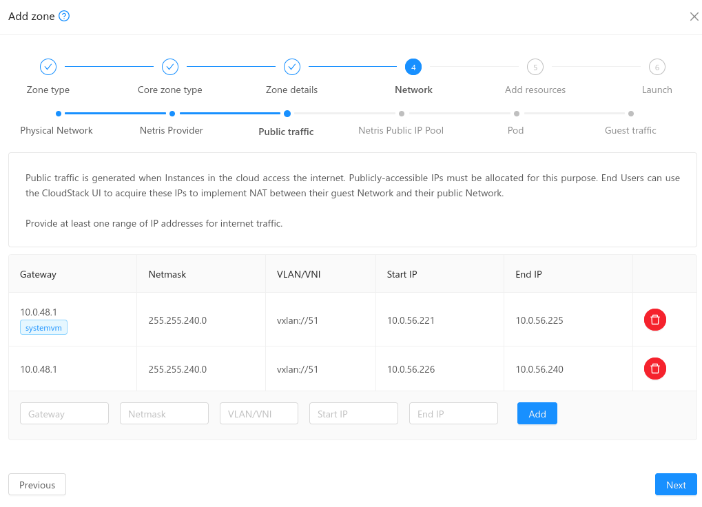 Public traffic: The first Public IP range defined on this section will be marked for system VMs (and a tag will be displayed accordingly, with the name ‘systemvm’). The next Public IP ranges defined on this section will be available for VR Public IPs.